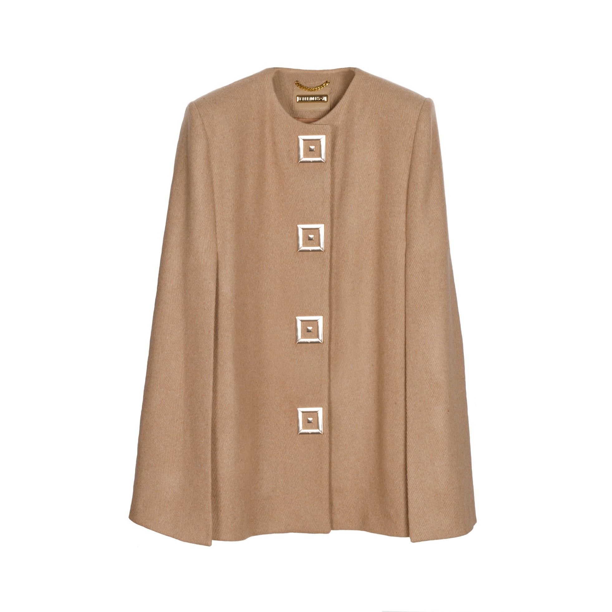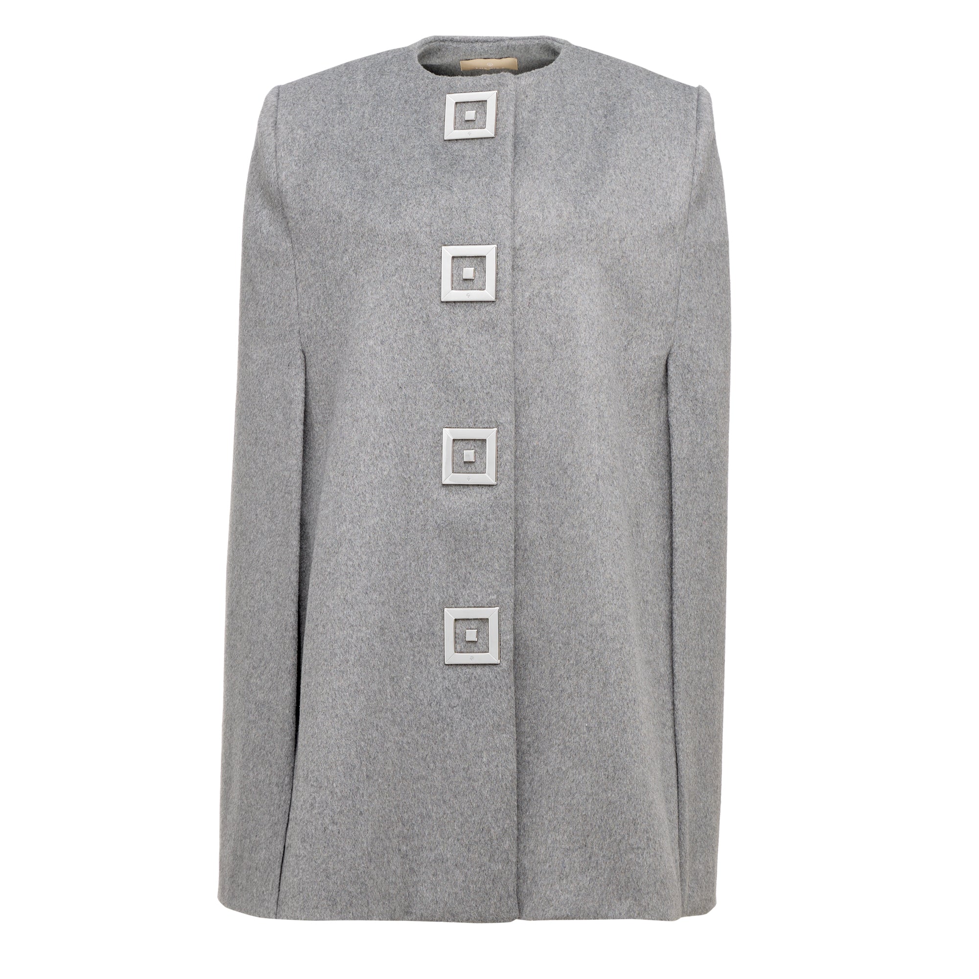 Elevate your outerwear with Antiope luxurious wool and cashmere cape, crafted for warmth, elegance, and effortless style. Featuring flowing lines and dramatic wool fringe detailing at the hem, it offers a bold yet timeless silhouette. The neckline is adorned with hand-embroidered wooden beads and metallic accents, creating a statement decorative element that blends artisanal craftsmanship with contemporary edge.Perfect over jeans or eveningwear, this cape adds a refined layer to any winter look.