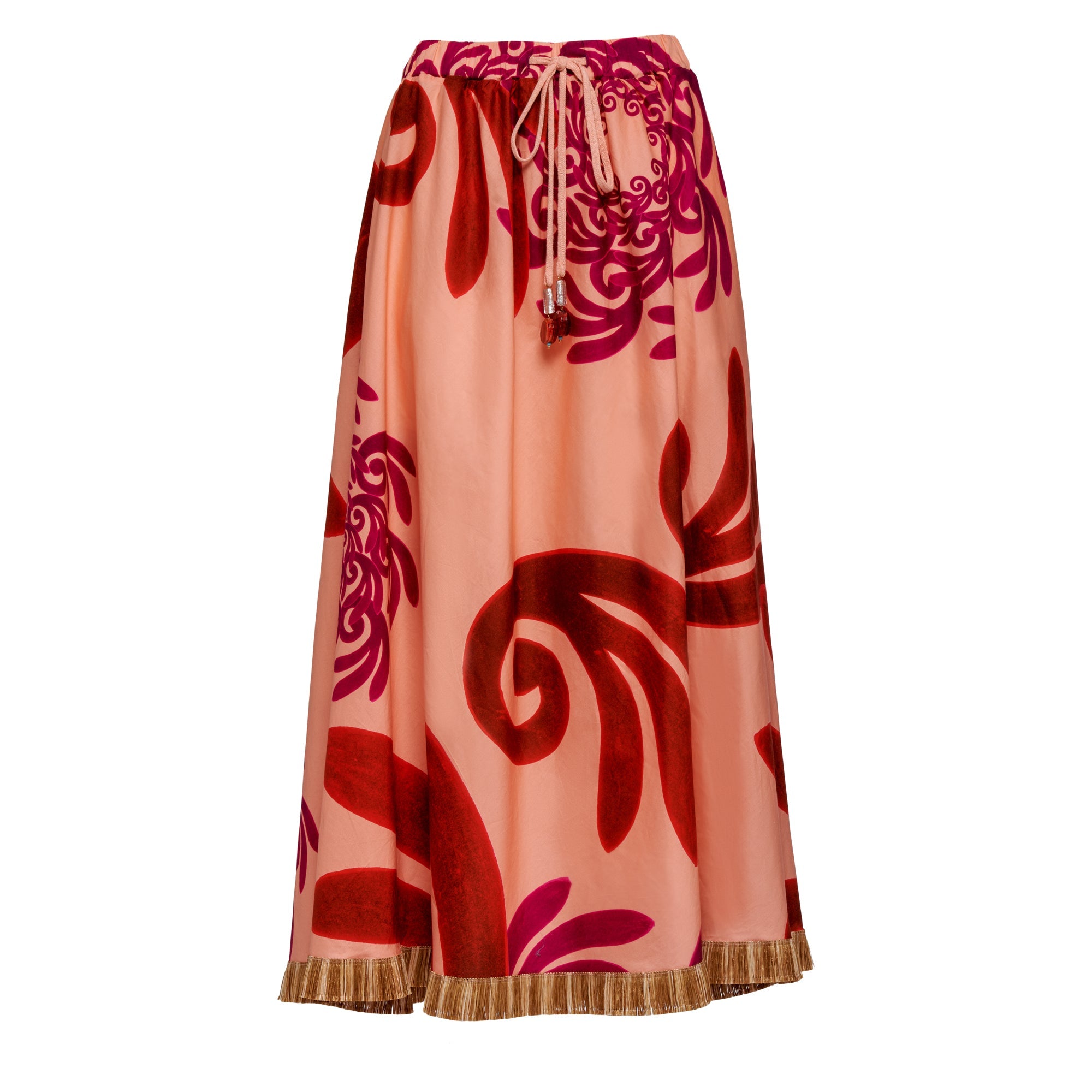Aura handmade trousers, handprinted with our new Gaia pattern in peach, red and magenda.