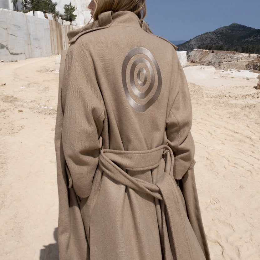 Themis Zouganeli has a keen eye for discreet yet powerful embellishments as she believes that can truly transform an outfit. Cut in a sharp tailored silhouette by our seamstresses who master their craft for generations, Themis Z’s Infinity golden button down cape alludes to one of the brand’s key philosophies: chic with a twist.