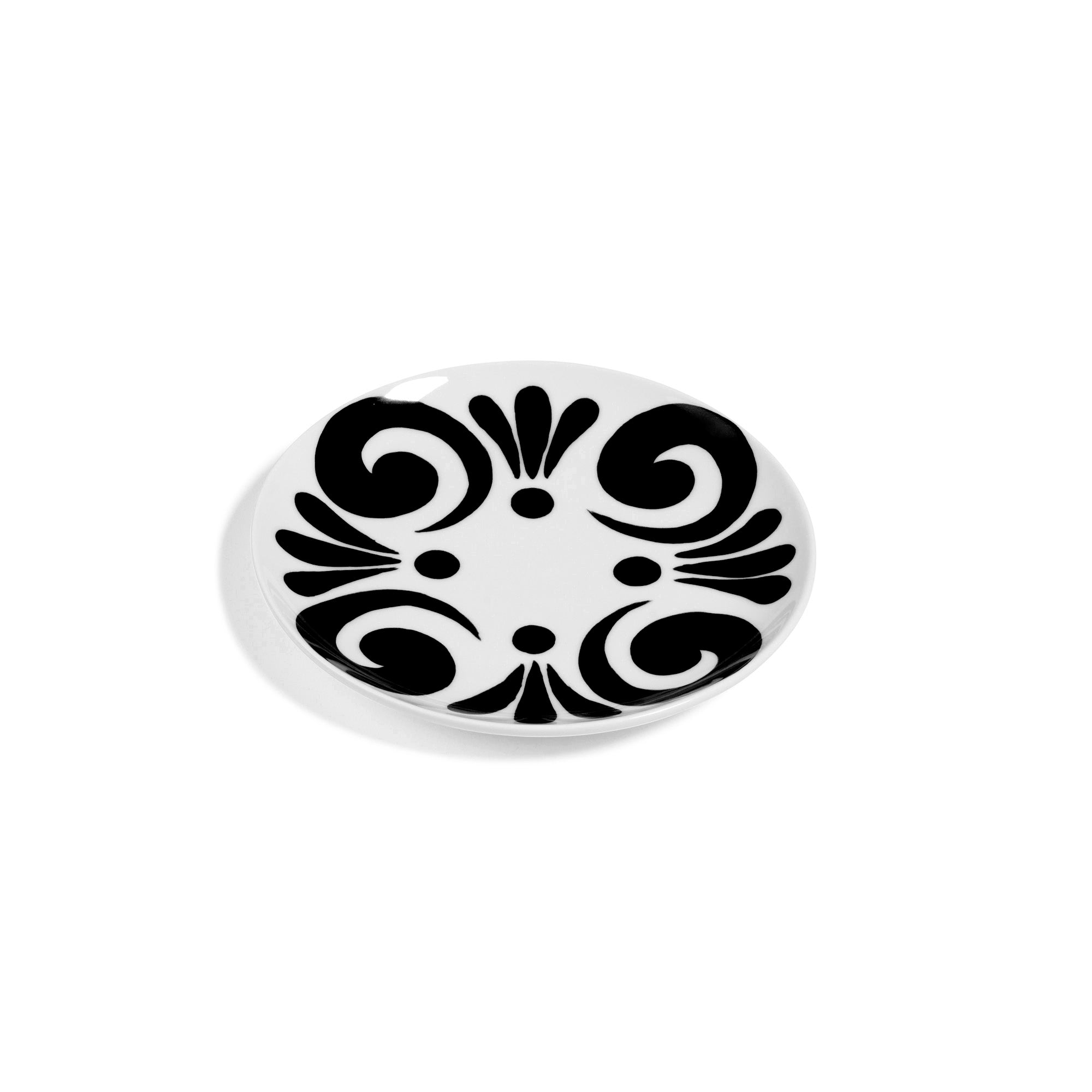 Handcrafted dinner plate in fine porcelain adorned with hand-painted Kallos pattern in black.