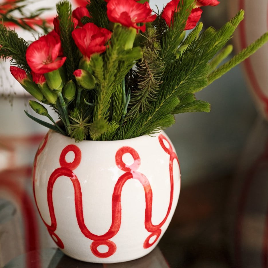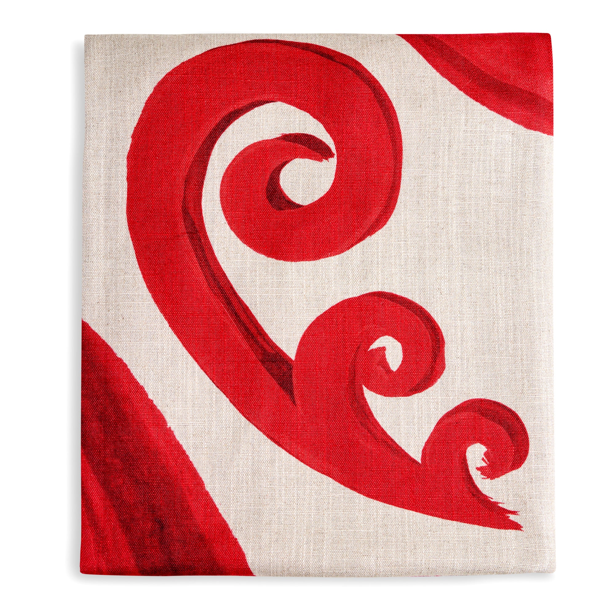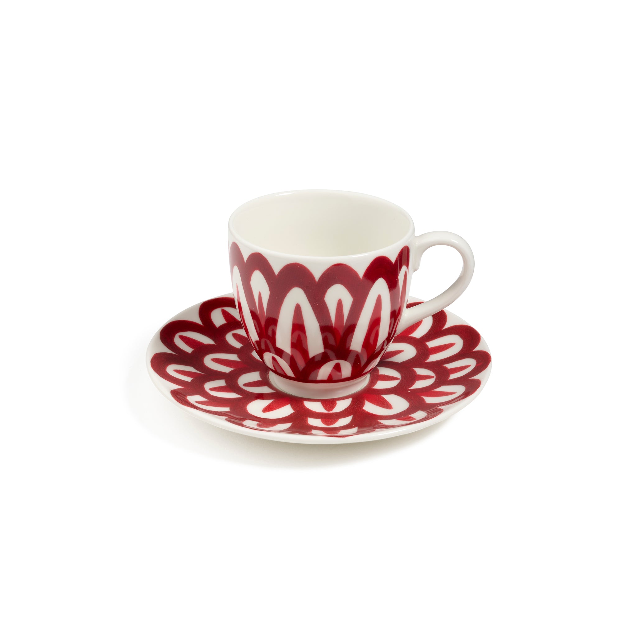 Handcrafted serving platter in fine porcelain adorned with hand-painted Helios pattern in deep red.
