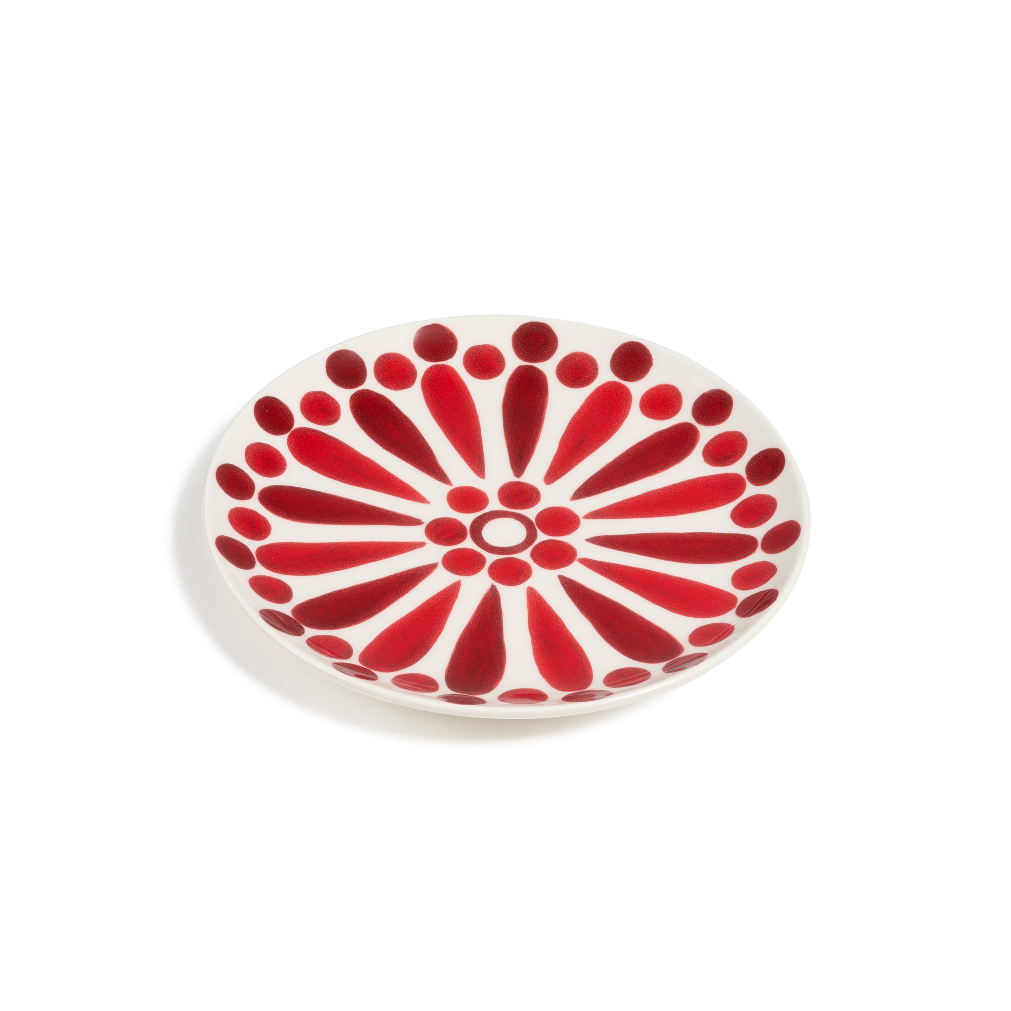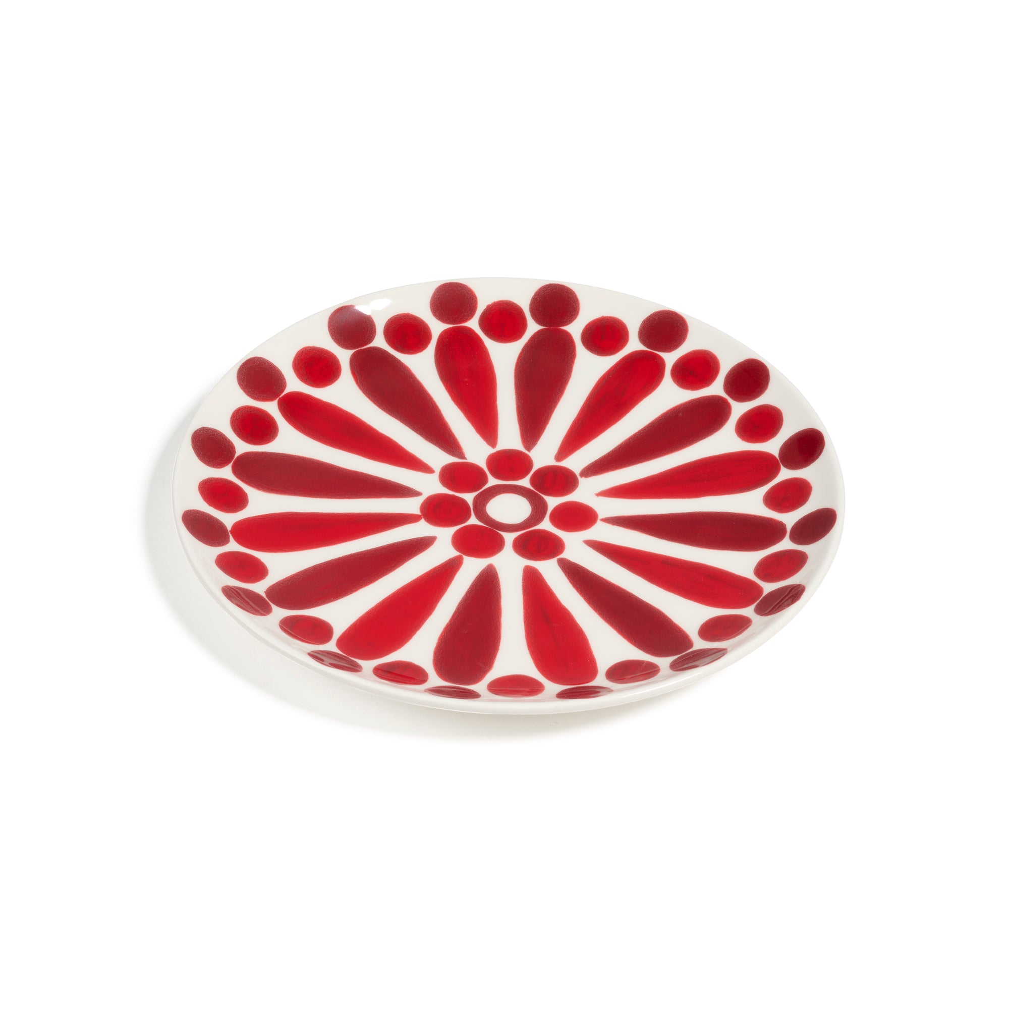 Handcrafted salad bowl in fine porcelain adorned with hand-painted Helios pattern in deep red.