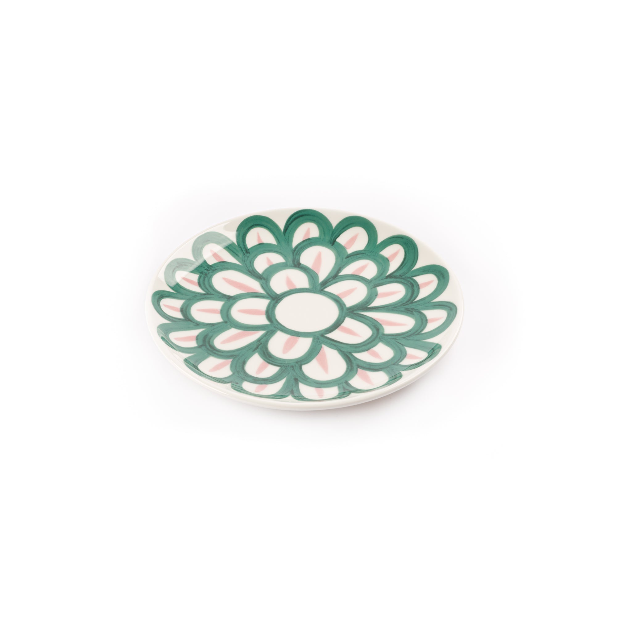 Handcrafted tea set in fine porcelain adorned with hand-painted Simy pattern in green & pink.