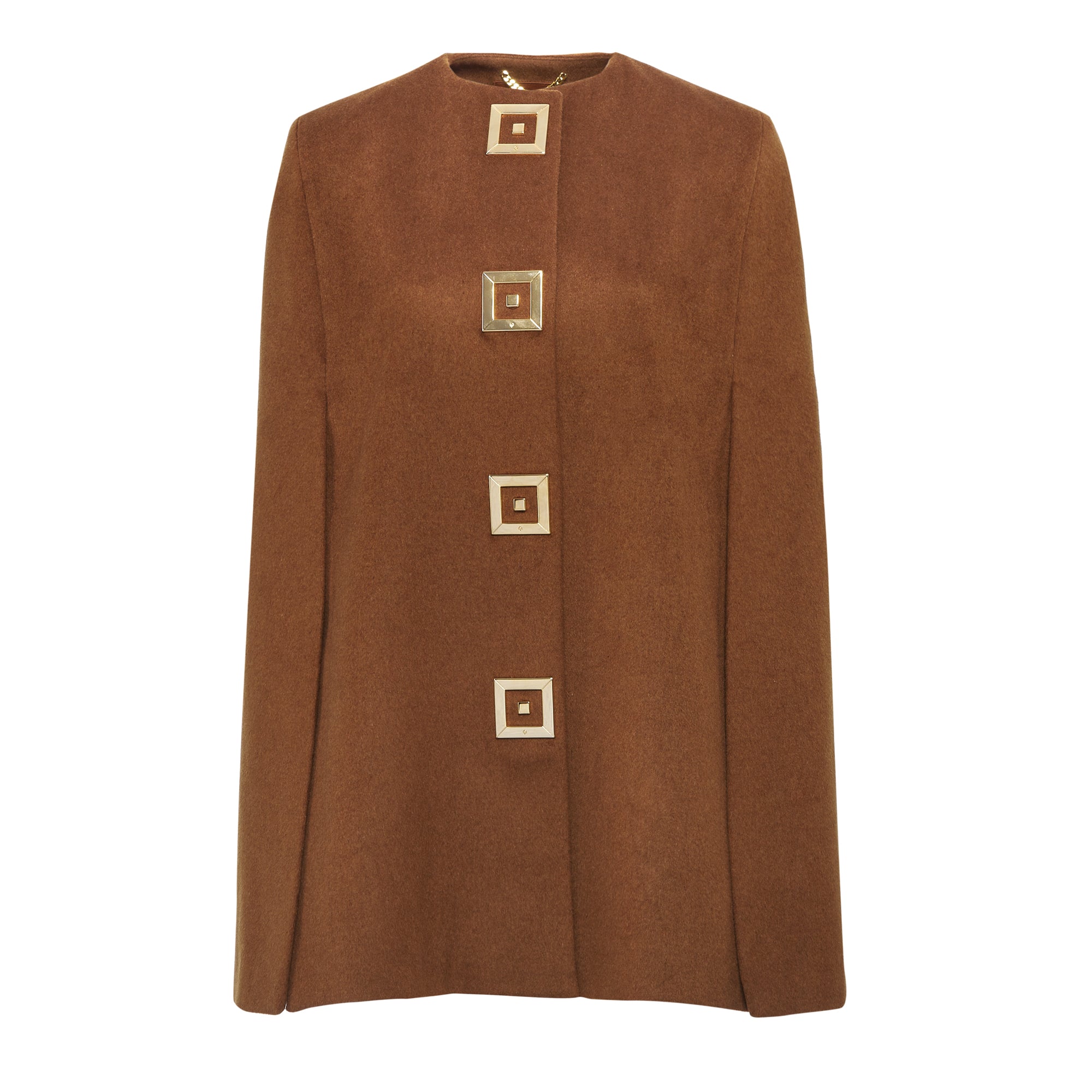 Cape with a round neckline and side vents. Decorated with golden metal Infinity buttons.