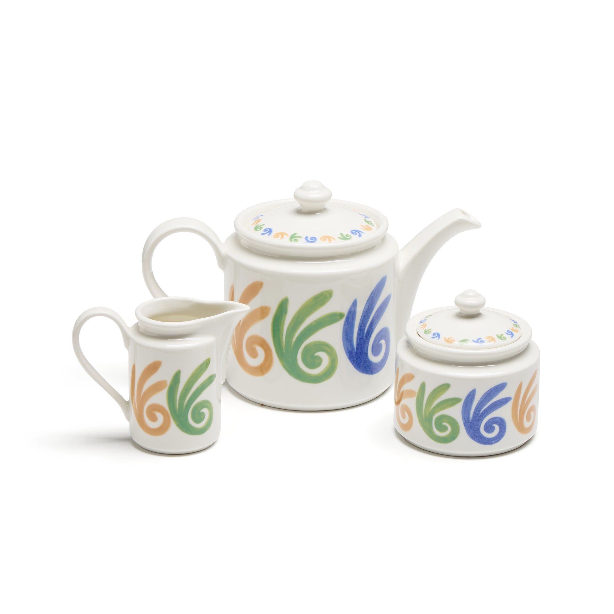 Handcrafted coffee / tea cup in fine porcelain adorned with hand-painted Gaia pattern in purple, pink & yellow.