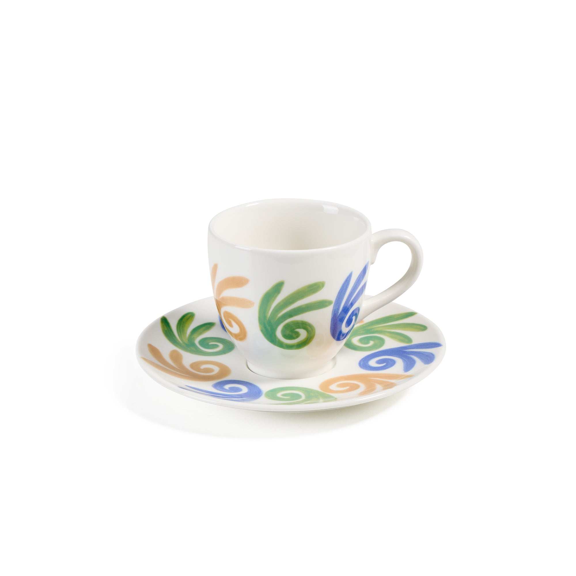 Handcrafted espresso cup in fine porcelain adorned with hand-painted Gaia pattern in light blue-green-ochra.