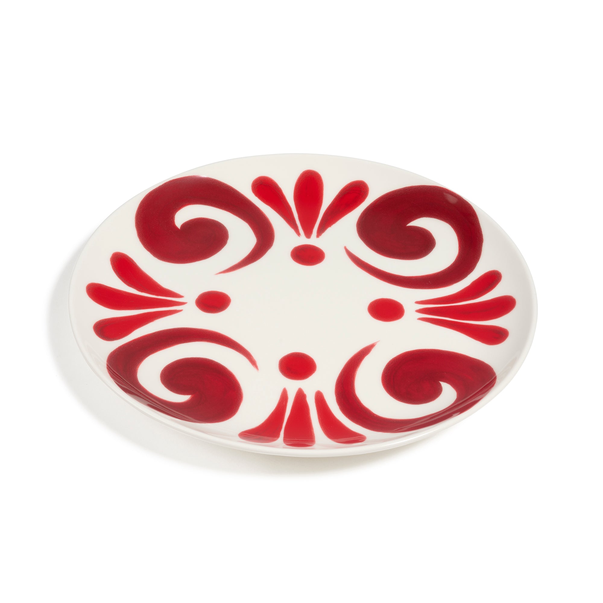 Handcrafted dinner plate in fine porcelain adorned with hand-painted Kallos pattern in deep red.
