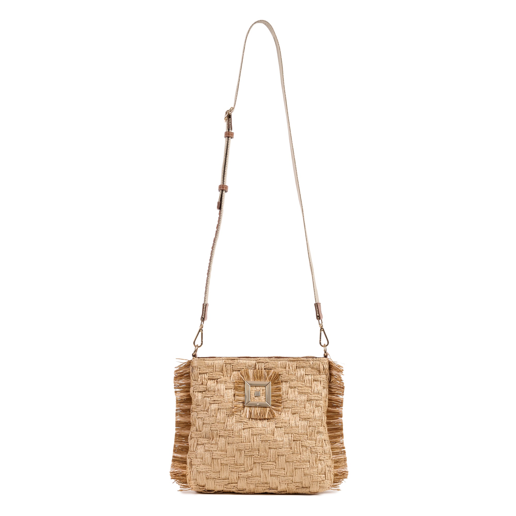Handmade fringed mini cross body bag made of straw decorated with a golden metal infinity pin and leather fringes.